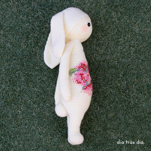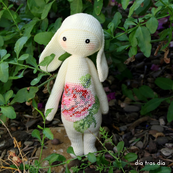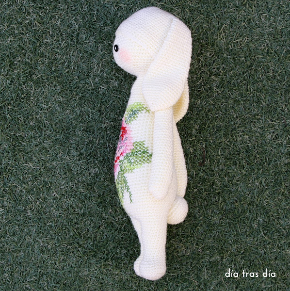 Pero además de toda la labor de crochet que lleva implícito este amigurumi, tenía una característica especial, que fue la que me llamó la atención. Y fue precisamente este detalle el que me permitió descubrir el mundo Lalylala: Rita tenía un motivo de punto de cruz bordado en su barriga. Y es que los puntos del crochet crean una retícula que es la que se puede emplear como soporte del punto de cruz.
