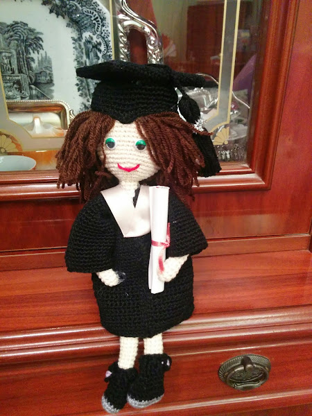 Dentro de poco va a hacer una año que mi sobrina mayor se graduó en ´Ciencias de la información" y para tal ocasión le hice esta muñeca graduada para entregársela cuando nos juntáramos a celebrarlo pero llego la pandemia y el confinamiento, así que aun no hemos podido celebrarlo como se merece y la muñequita sigue en casa esperando su destino definitivo.