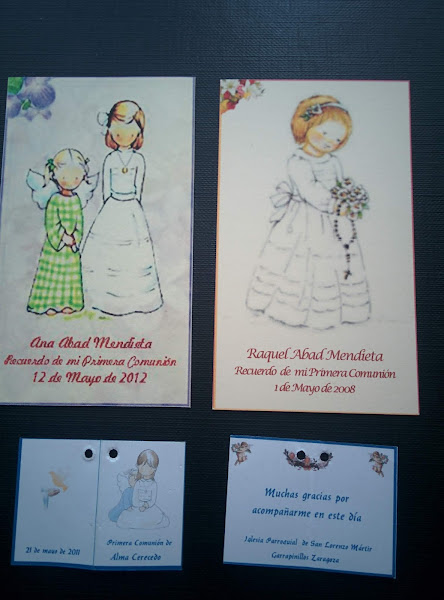 Lo pasamos muy bien colaborando todos en hacer los recordatorios y los marcapáginas. Los libritos que aparecen abajo son de la hija de una amiga que hacía la Comunión por las mismas fechas y aprovechamos para hacerle los detalles para regalar, lo podéis ver AQUI, fue mi regalo de Comunión porque como digo en la entrada original, ¿qué se le puede regalar a una niña que lo tiene todo o casi todo? pues los detallitos para regalar en el día de su Primera Comunión y los regalitos iban con su respectiva tarjetita recordatorio.Los Recordatorios de mis sobrinas como podéis apreciar no eran muy modernos, los dibujos eran parecidos a los que se hacían cuando su madre y yo hicimos la comunión, muy de los sesenta y setenta y eso que Ana, la pequeña, eligió un modelo mucho más moderno con ese ángel con traje de cuadros y es que ella siempre ha tenido mucha personalidad.
