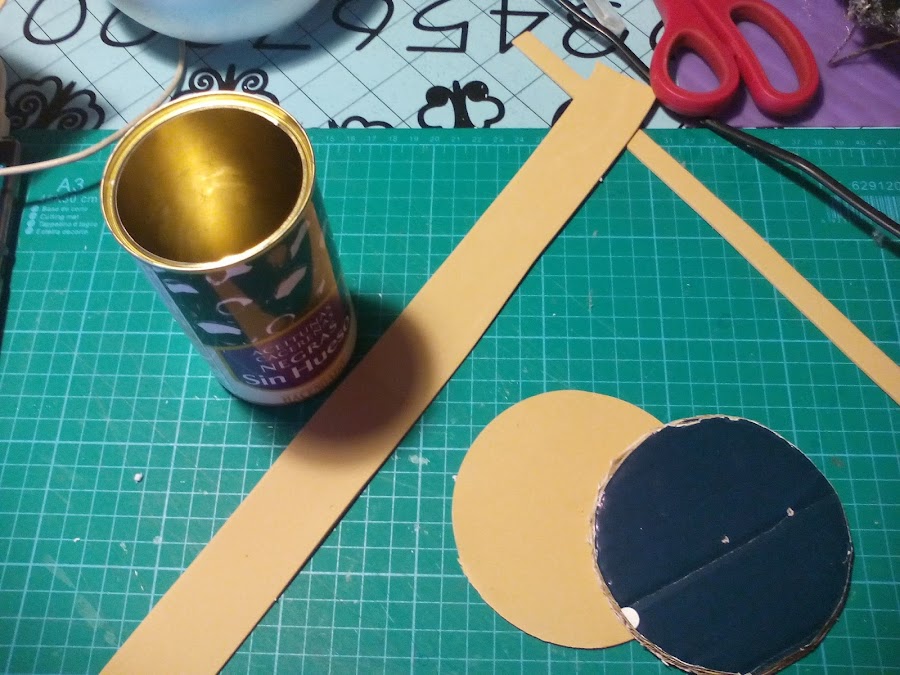 Hacemos una base de cartón y forramos el borde de la lata para no corte.