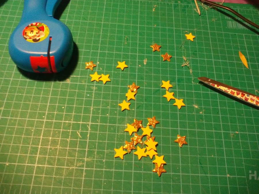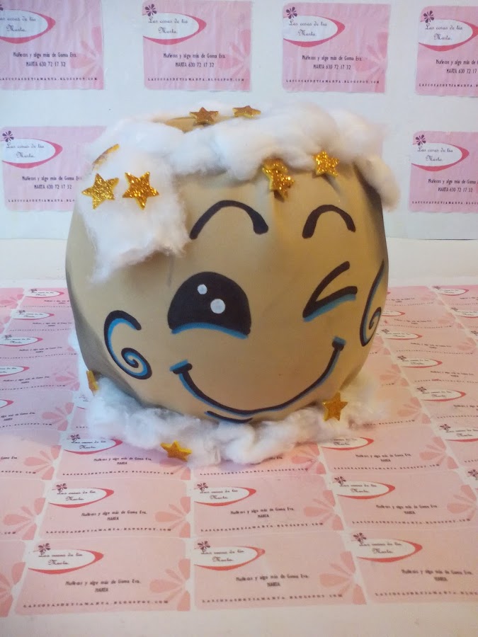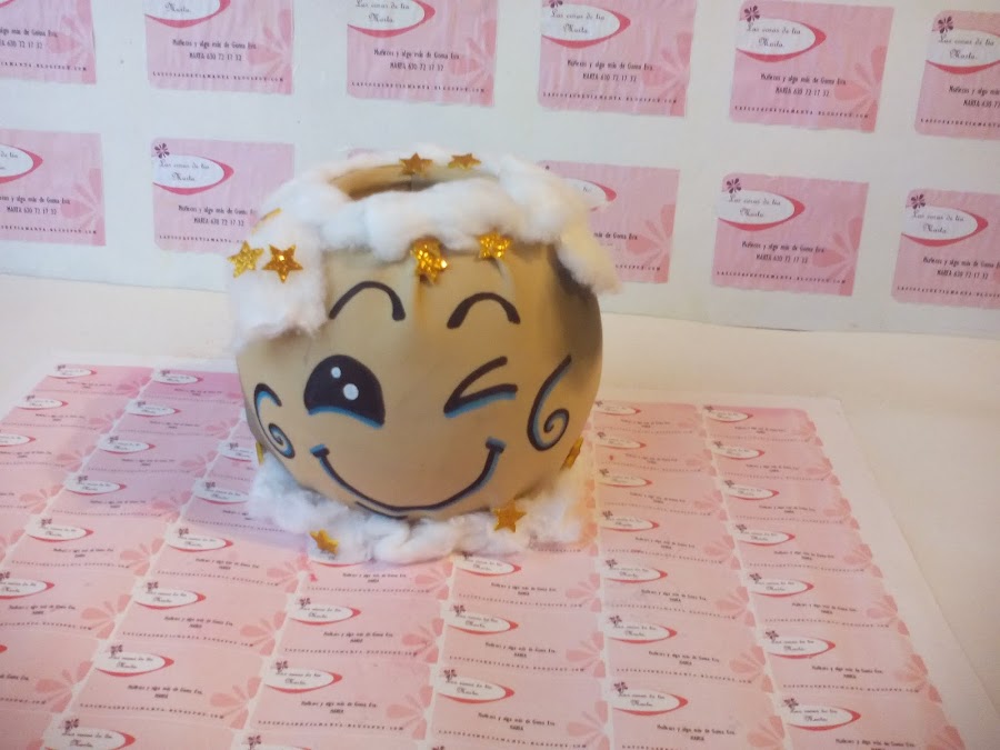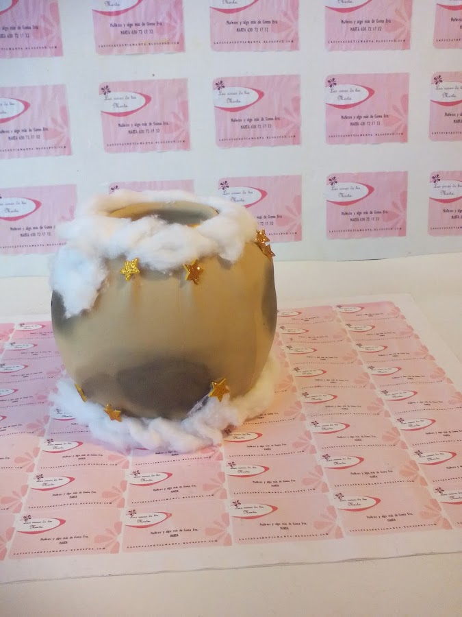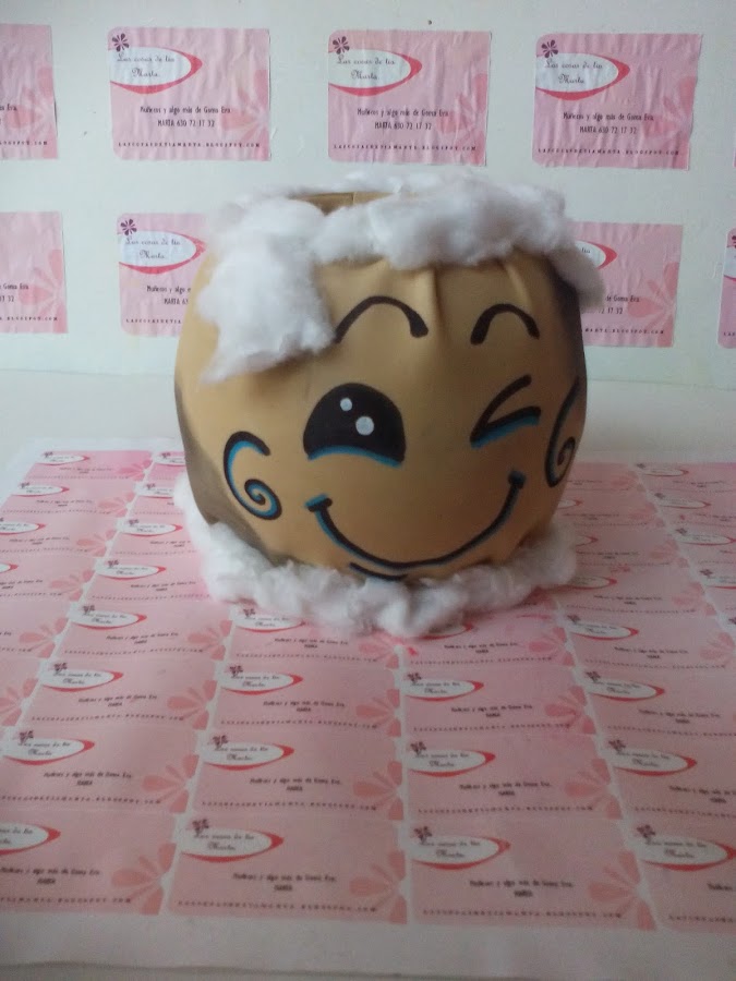6. Dibujamos la cara, decoramos con algodón y estrellas de purpurina.