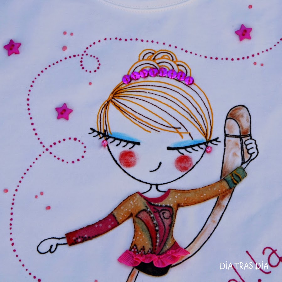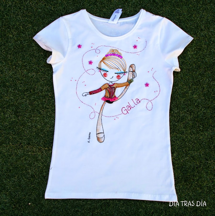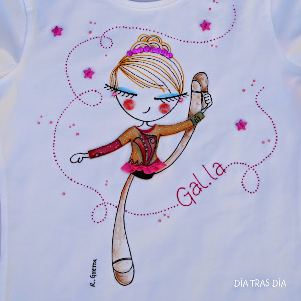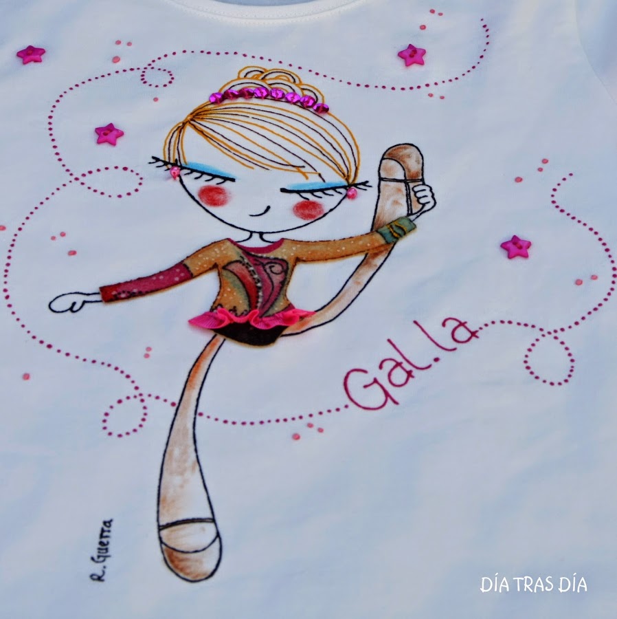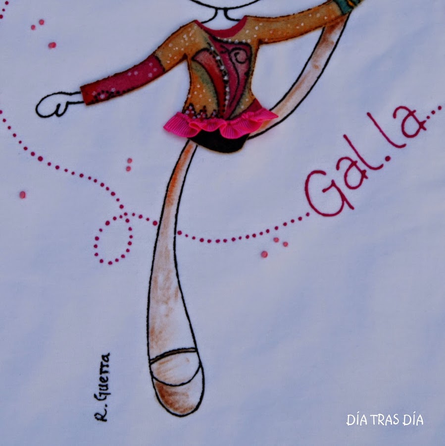 En esta ocasión os voy a enseñar la variante que ha surgido tras la petición que me hizo Celia de una camiseta para regalar a su hija para su cumpleaños. Su hija hace gimnasia rítmica, así que después de haber visto la Ro-ro patinadora que os enseñé hace algunas entradas (aquí), a la que personalicé con el maillot como el que usa Margarita, Celia me pidió que hiciera esta versión de Ro-ro con un maillot como el que lleva su hija Gal.la en sus clases de gimnasia.