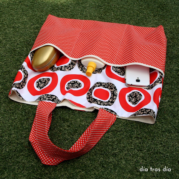 Me pareció muy buena idea poder darle un toque un poco distinto al bolso, así que, partiendo de la misma idea, ampliando medidas e incluyendo un interior más completo, el bolso se convirtió en una bolsa para la playa de lo más práctico. Para ello combiné varias telas con el color rojo como protagonista, para darle un carácter alegre y veraniego.