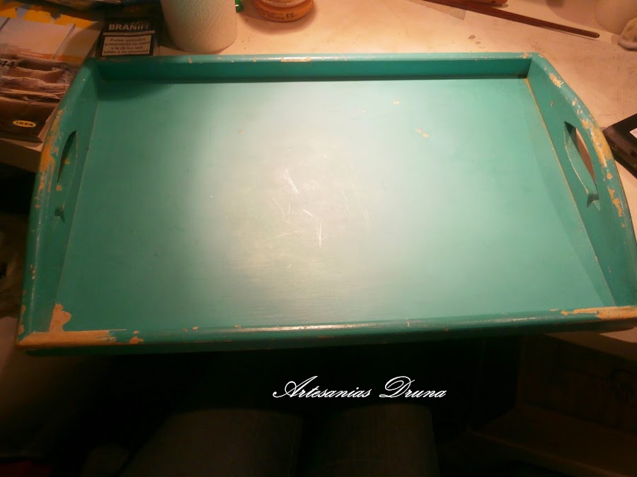 Bandeja de madera restaurada artesanalmente, incluyendo decapados, masillas, lijados y acabados. Está decorada con acrílicas y decoupage de servilletas. El acabado es sintético para que aguante bien el paso del tiempo Precio: 40 â?¬