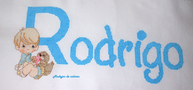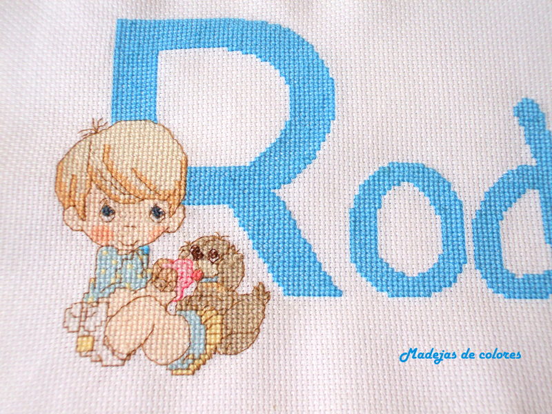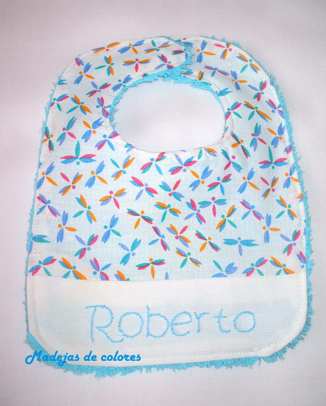 Esta labor viajó a Madrid y como no es la primera vez que acude a mi y ya nos tenemos mucho afecto, quise tener un detalle para el niño y le hice un babero bordado, en los mismos tonos.