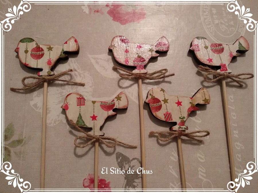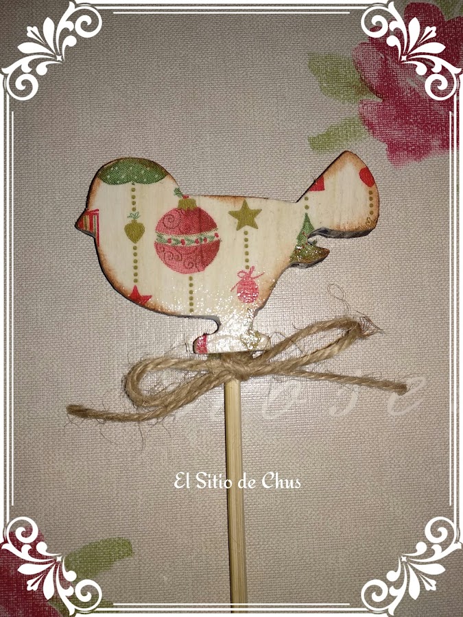Decoré estos pajaritos con dos técnicas diferentes, una por cada lado. Por la parte de delante, decoupage con un pañuelo de papel de Navidad y envejecido con tinta.