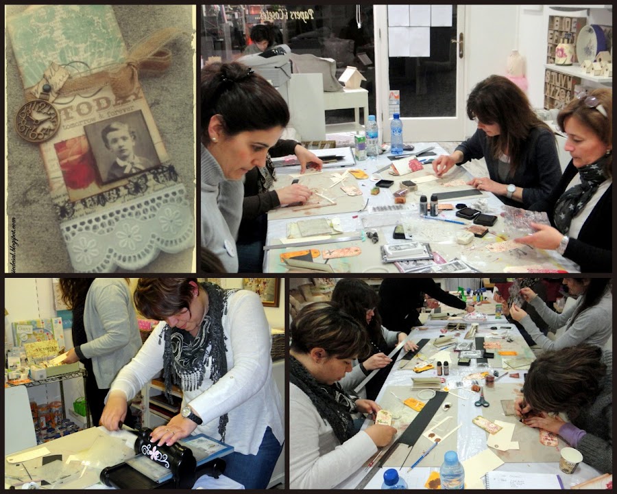 Taller en "Las Casitas de Papel", una acogedora tienda donde sabéis que vengo impartiendo talleres de scrap cada mes... la verdad es que hasta hace poco era bastante desconocido alli, sin demasiadas adeptas, pero ha sido empezar con los talleres y a despertarse mucho interés, estan encantadas y ansiosas por aprender todo lo que puedan... así que, a partir de ahora intentaremos hacer un taller de iniciación y uno de nivel avanzado para que las que le tienen un poco de desconfianza aun, se animen, y las que se han soltado la melena, disfruten al máximo!!!!