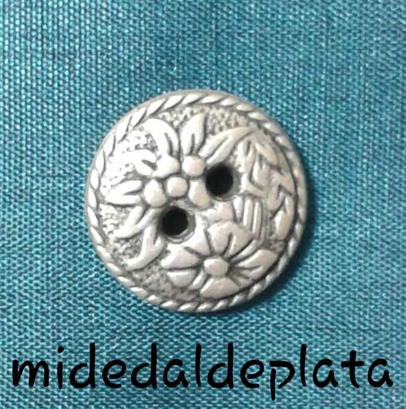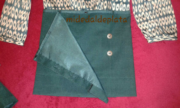 Adornamos las prendas con botones metálicos color plata, confiriendo un estilo austriaco. Para el cierre de la falda utilizamos cuatro, y uno para adornar la cinturilla del pantalón.