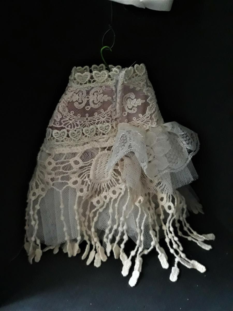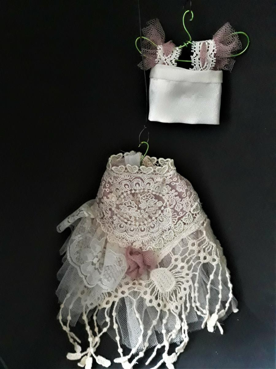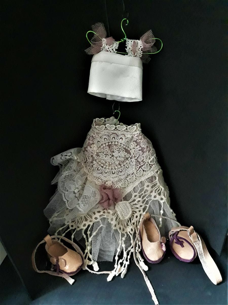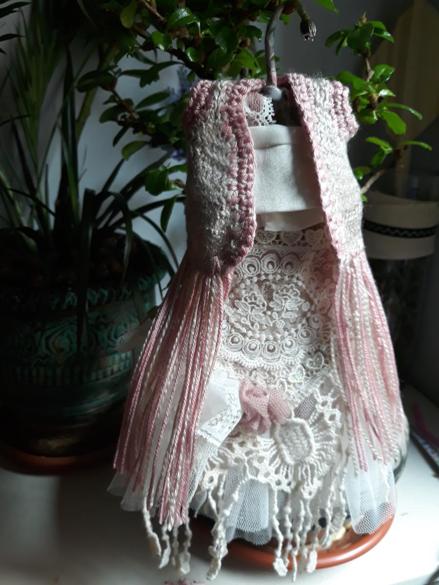 Está todo hecho a mano por mí y lleva una falda de raso como forro y en el cosido tadas las puntillas y el túl, el top es de raso con tirantes de puntilla y túl, el chaleco es de algodón tejido a crochett, los zapatos son de piel, también hechos por mi, espero que os guste.