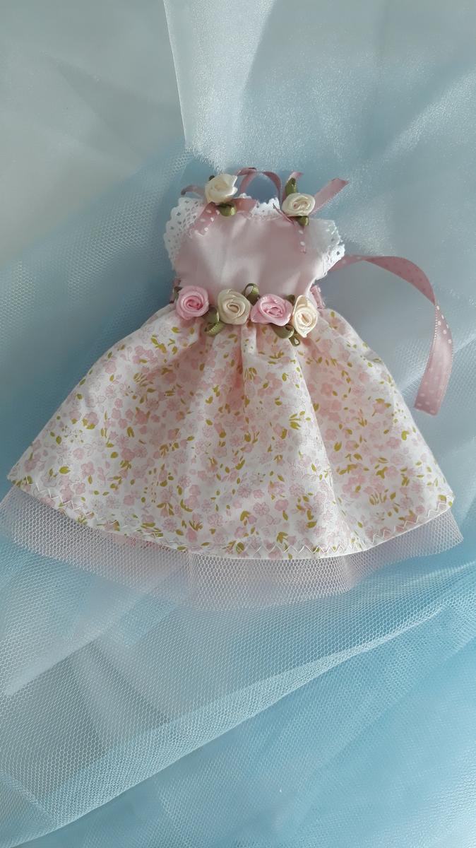 Vestido de tela de batista, forrado y con cinturón de florecitas de cinta de raso.
