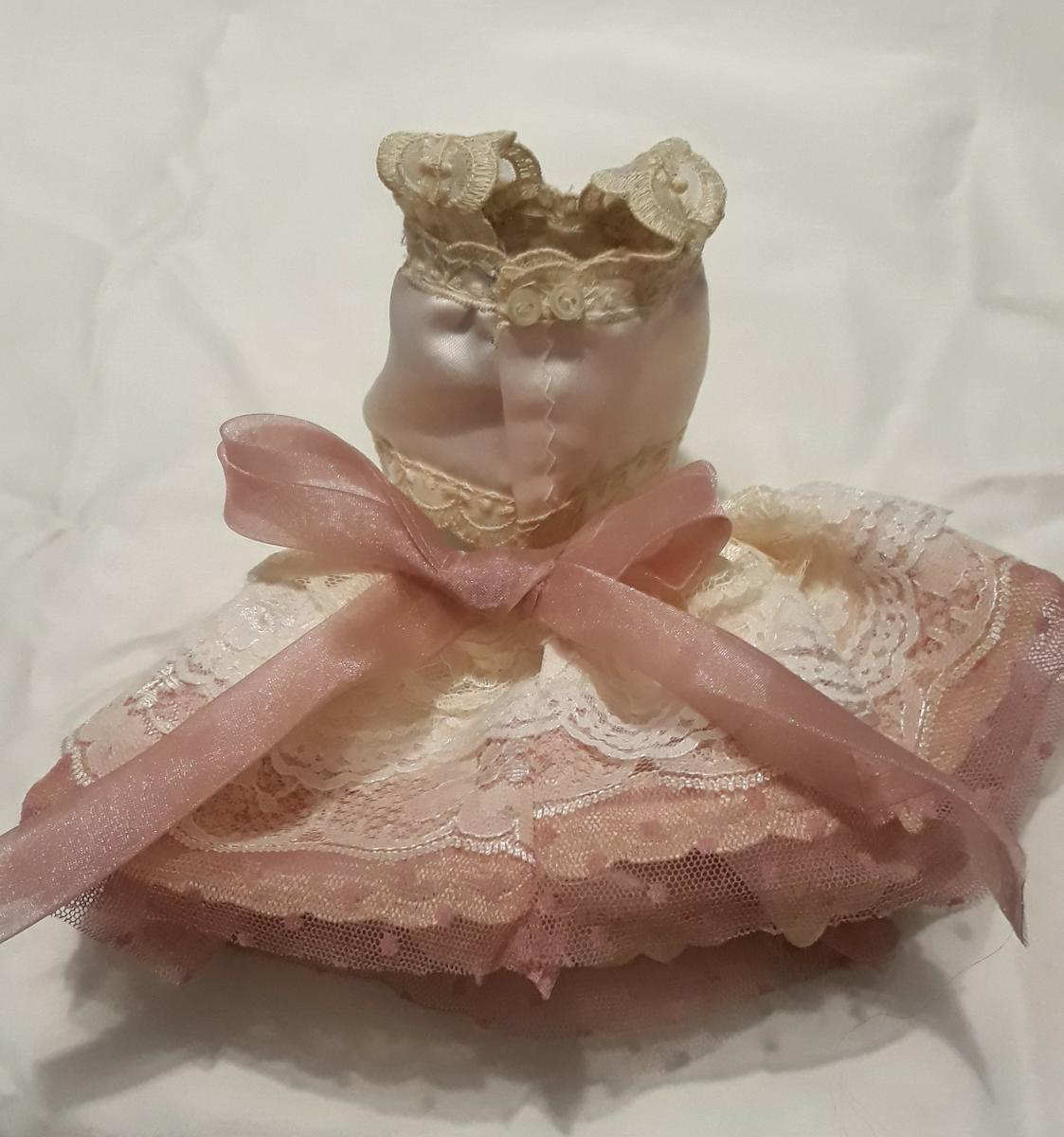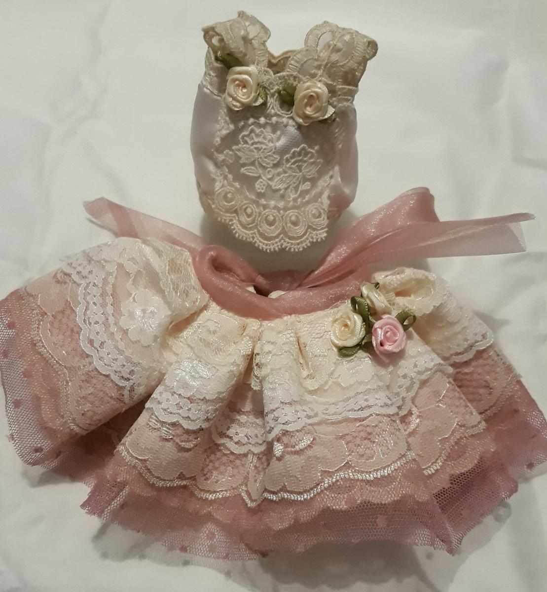 Conjunto de faldita con peto y braguita con volantes de puntilla, la falda está redondeada en la parte de atrás para que se vean las braguitas, también tiene un gran lazo.
