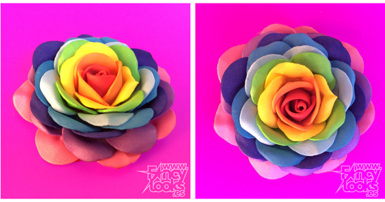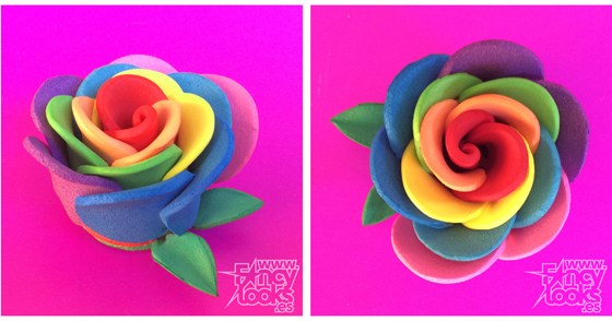 Pensé que ya estaba lista para hacer mi rosa arco iris de goma eva. Decidí hacer una con los colores del arco iris más el rosa. Utilicé tres pétalos rojos para hacer el cono del centro más la primera capa y luego fui añadiendo dos pétalos para cada uno de los colores, en este orden: naranja, amarillo, verde brillante, azul clarito, azul turquesa, azul royal, violeta y rosa. Y me quedó así: