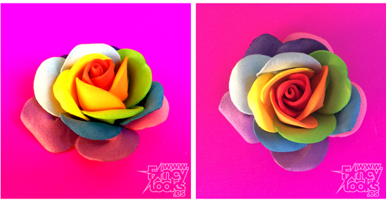 Antes de ponerme a usar los colores del arco iris, probé a hacer una rosa de foamy con todos los pétalos del mismo color. Para ello elegí goma eva de purpurina rosa, de grosor normal (2 mm) y usé el método de montar la rosa que tanto me gusta utilizar con papel y que explico en este video. Todos los pétalos están cortados con una taladradora circular de 25 mm de diámetro. Para darle forma al borde de los pétalos una vez ya montados en la rosa, utilicé el calor de una velita y mis dedos, o me ayudé de un palillo mondadientes para curvarlos.