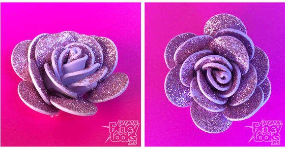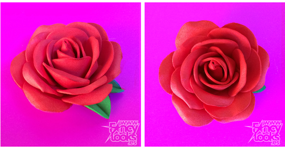 Me dí cuenta de que el problema de la falta de realismo no estaba en la purpurina, sino en el grosor de la goma eva, que le daba un aspecto bruto a los pétalos. Así que probé el mismo método de nuevo, pero esta vez utilizando goma eva de 1 mm de grosor y de color rojo... y el resultado me dejó totalmente enamorada!!!