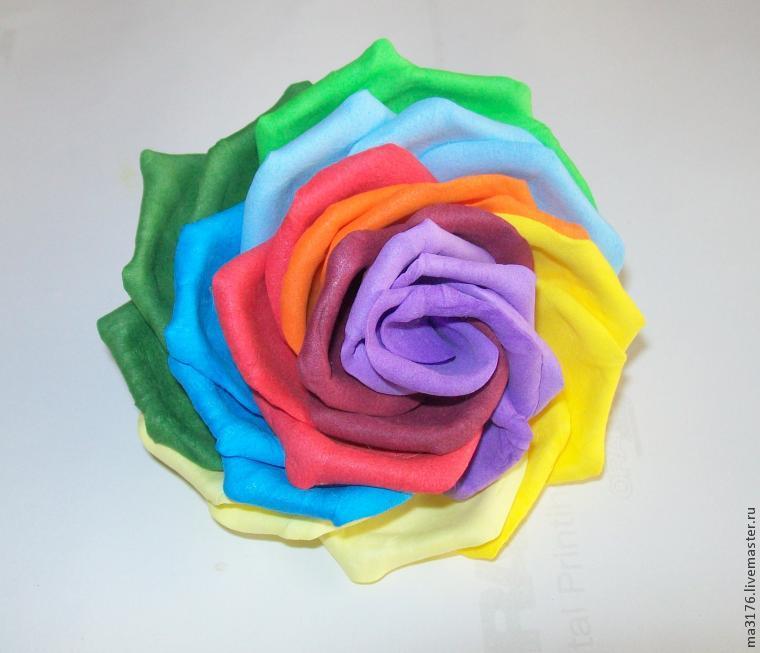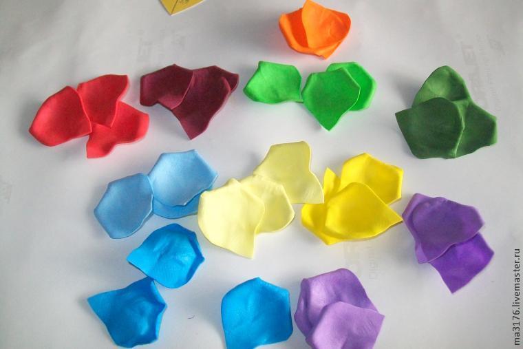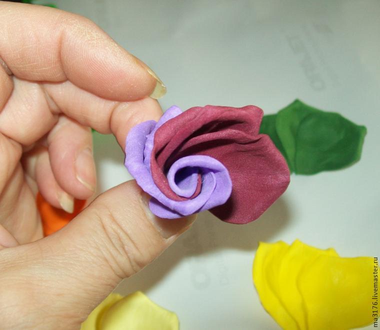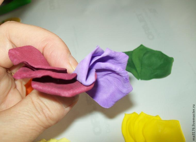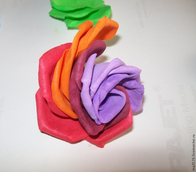 Pegamos los pétalos del mismo color con la silicona caliente (o pegamento instantaneo), como abanico. Y luego juntamos los conjuntos de pétalos en una rosa.