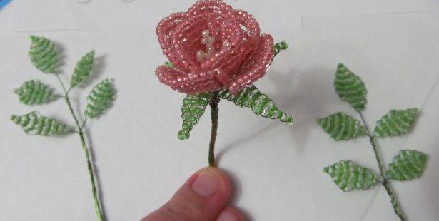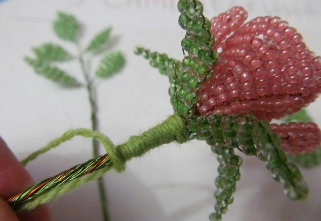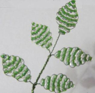 Ahora vamos a tejer las hojas. Necesitamos 6 pedazos de alambre de 30 cm de largo. Vamos a tejer en este orden: 1 + 2 + 3 + 4 + 3 + 2