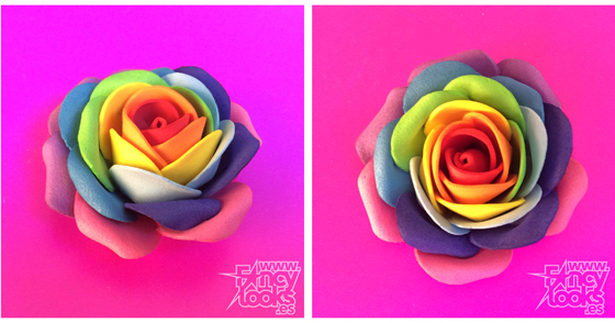 Me pareció excesiva... me recordaba un poco a un repollo multicolor, parecía que no daba hecho la flor a mi gusto! Me dí cuenta de que mi flor anterior estaba más acertada que ésta en la forma que coloqué los colores de los pétalos, y de que además, si la anterior me había quedado escasa de pétalos, esta me quedó exagerada. Así que retomé la forma de hacer la rosa anterior, pero usando 3 pétalos de cada color, en vez de dos, y continuando la secuencia de colores en cada capa, sin esperar a completarla toda de un mismo color. Y el resultado, por fin, quedó como quería... realista, delicada, multicolor y muy decorativa!!!!