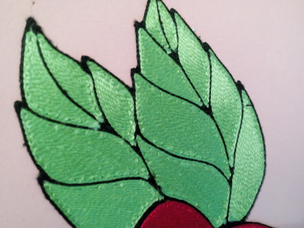 Un detalle de las hojas, según me explicó se hace o copia un dibujo y se forra con cinta transparente de doble cara, se remarca con hilo de bordar negro las partes que queremos resaltar y seguidamente se rellenan las distintas partes del dibujo con los hilos de distintos colores, siempre hay que poner el hilo en la misma dirección. Una vez finalizado el trabajo se recorta el dibujo y se pega en una cartulina o cartón. Como véis se necesita mucha paciencia y buen pulso paa hacer algo tan bonito.