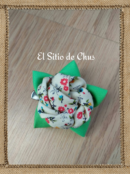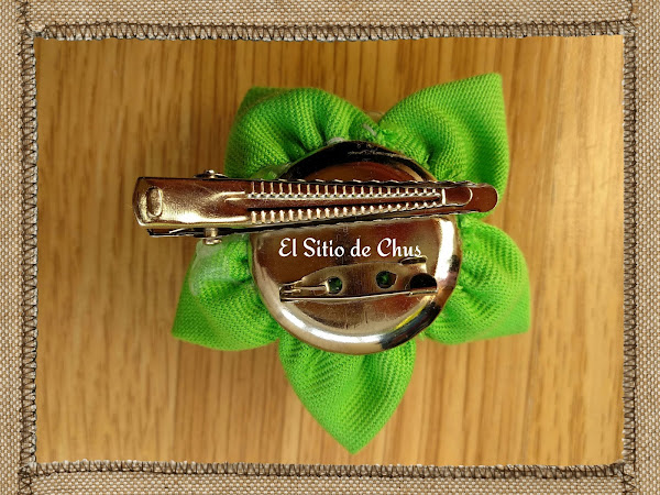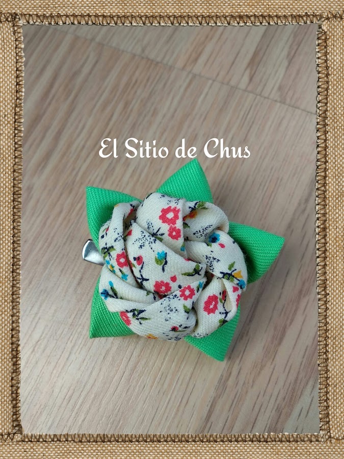 Cuando hice la rosa siguiendo las indicaciones de Amparo pensé que la usaría mucho más si en vez de pegarla en un boli, la pudiera usar como complemento, así que la pegué en un broche doble, de ésos que valen como broche y como pinza del pelo.