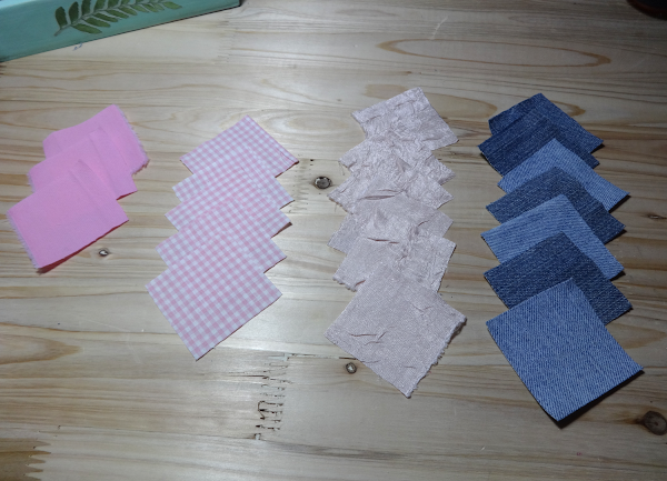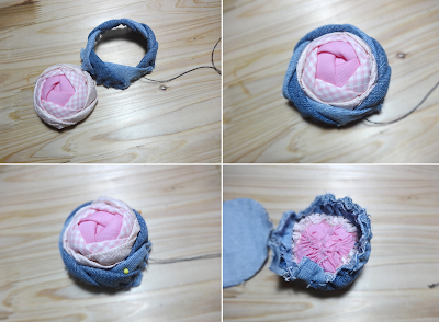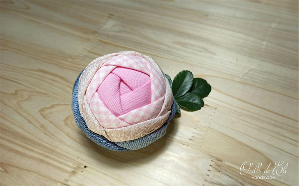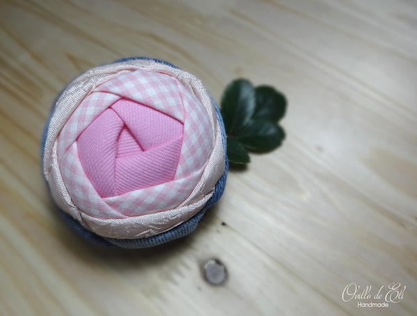 He usado tela de otros proyectos en una gama de colores similares y que van ascendiendo en tonalidad, del color más intenso para el centro de la rosa al más claro y yo he puesto la tela de jeans al final para darle soporte a la rosa