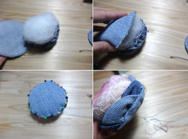 Por ultimo he cortado un circulo de 9.5 cm de diámetro, que sobresalía a la forma de la rosa, y que fui acomodando con alfileres para luego coser con punto invisible, en esta paso he rellenado lo suficiente el espacio para dar firmeza al alfiletero