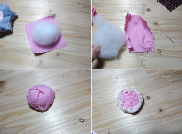 Entonces me di cuenta que la rosa quedaba plana, por esto realicé este cuadro de tela de 9.5 cm de lado (mismo color que los pétalos iniciales) y que rellené de guata para formar una bola donde apoyar los pétalos iniciales, luego la siguiente rueda de pétalos los cosí a los pétalos previos y así sucesivamente, esto se puede hacer con máquina de coser, pero lo he hecho todo a mano y estas son las imágenes que no se ven en los tutoriales, es decir como se ve por debajo