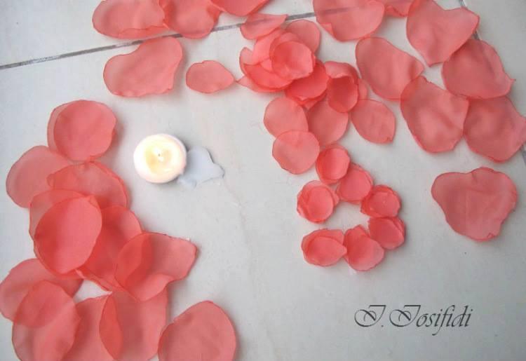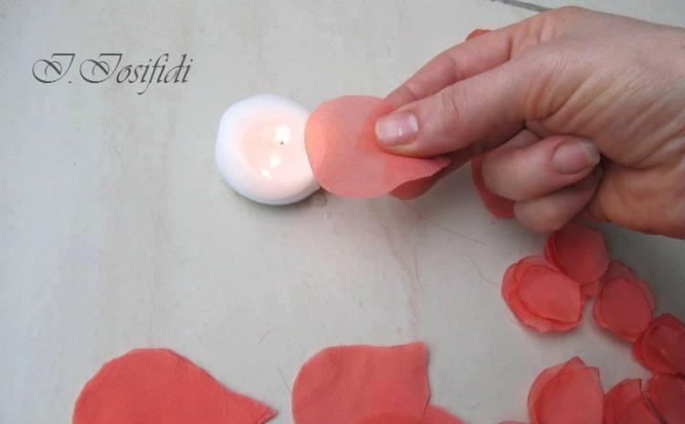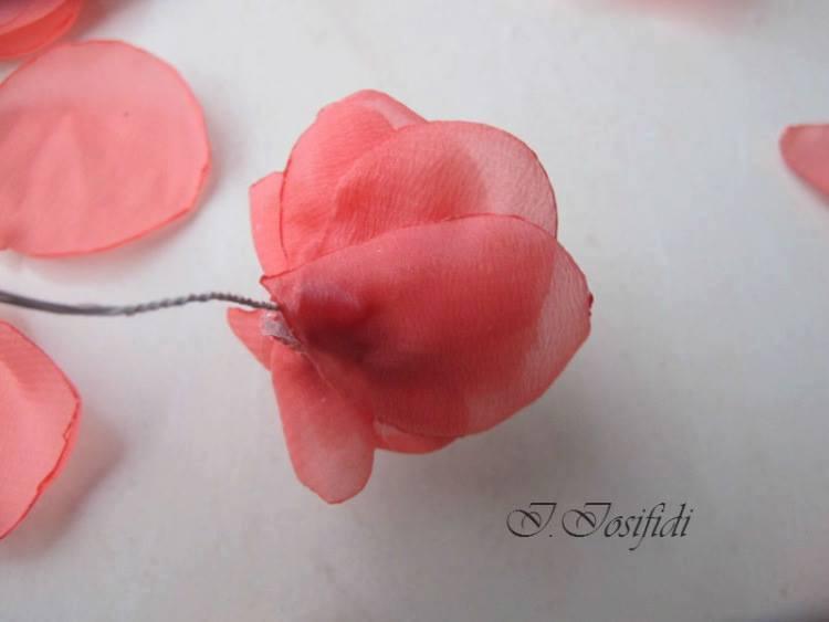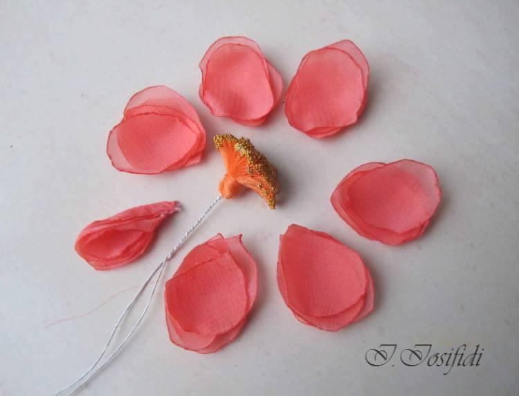 Primero recortemos los pétalos de chifón. Como la tela es muy ligera y transparente se requiere paciencia y muchos pétalos