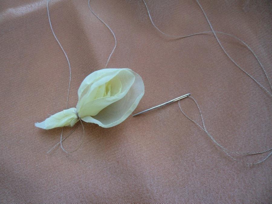 Acomodamos los pétalos en reducción y los juntamos con el hilo y aguja.