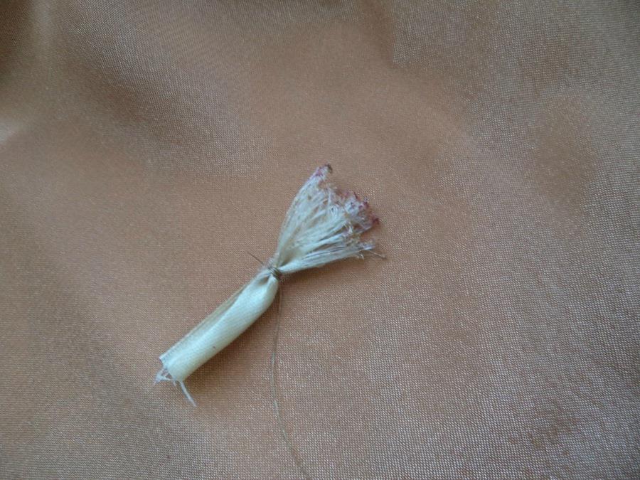 Los estambres se hacen con los hilos blancos cubiertos con cola sintética y secados para mayor rigidez. Después a todo el ramo de hilos sumergimos sus puntitas en la cola sintética y acto seguido en sémola de trigo (le pueden dar color previamente con cualquier pintura de escritorio).