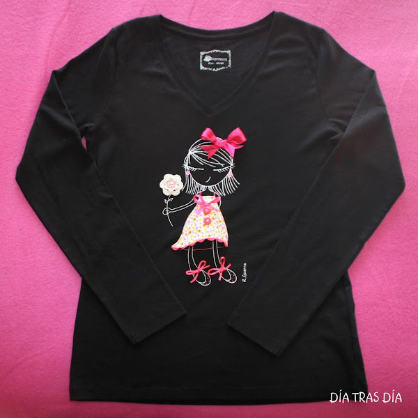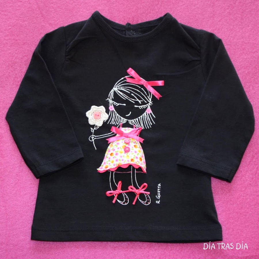 Y ya que se había planteado así, se lo contó a su cuñada para que ella pudiese elegir el modelo a su gusto. Y la elección final al principio me resultó un poco chocante, porque quería que las camisetas fuesen en color negro y complementos alegres. Si, las dos, incluso la de la peque que era en talla 6-9 meses. Pensé que me iba a resultar difícil conseguir una camiseta tan pequeña en este color, pero como soy un poco cabezota, antes de plantearle un color alternativo, la busqué y finalmente la conseguí ;-).