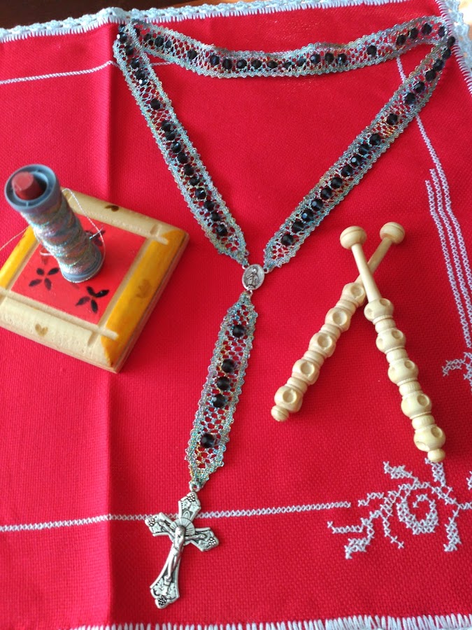 una buena idea hacer rosarios de bolillos totalmente artesanales en los que podemos ir variando tanto el color del hilo como el de las piedrecitas.