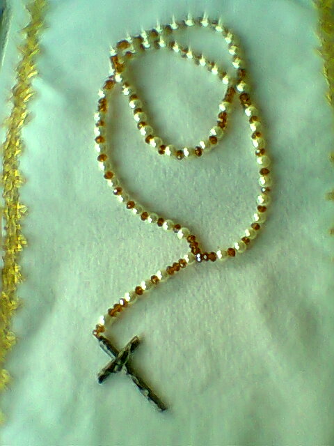 Perlas y cristal color topacio, cristo de nikel con aplicación de pátina negra (para darle un aspecto antiguo), mide 50 cm de largo.