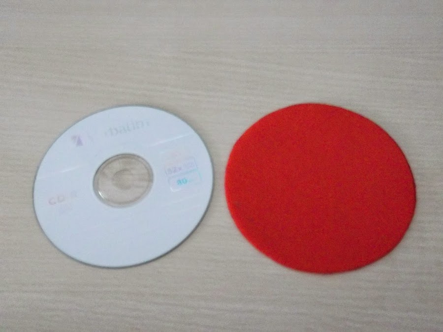 Cogemos un trozo de fieltro del color que queremos que sea nuestra rosa. Ponemos el CD encima, dibujamos su contorno y lo recortamos.
