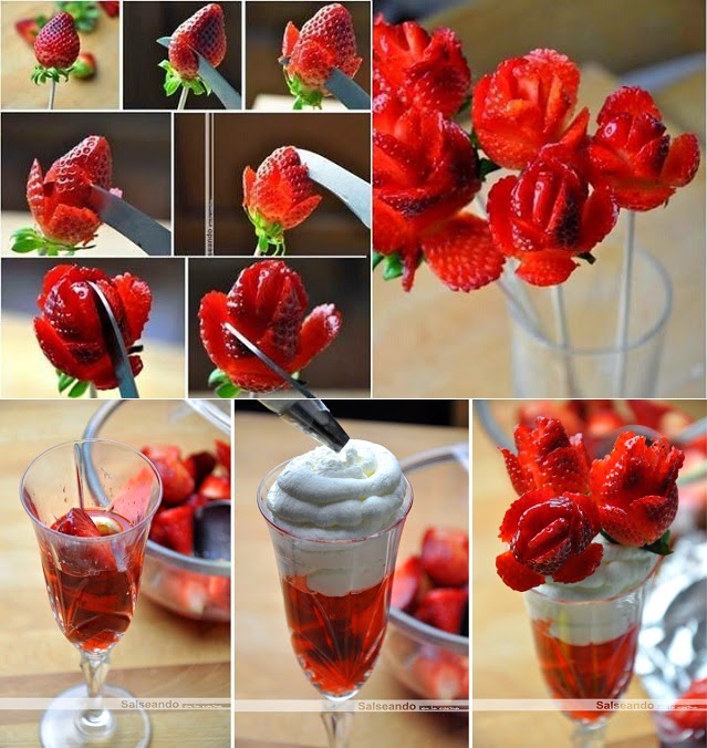 Lavar las fresas y elegir las más bonitas para la decoración, mejor que sean grandes. Coger el restos de fresas limpiar, trocear y poner en un bol con el jugo del limón, dejar macerar. Por otro lado coger las fresas de decoración, y adherir al palo, con un cuchillo pequeño hacer cuatro cortes consecutivos en la base de la fresa, avanzar hacia la parte superior haciendo otros tres o cuatro cortes interpuestos a los de la base. Al final deben quedar cuatro pétalos en la parte superior, otros cuatro en medio, y dos pétalos en la parte superior. En el fondo de una copa poner las fresas maceradas con su jugo, encima un poco de nata montada. De toque final pinchar las rosas de fresa.