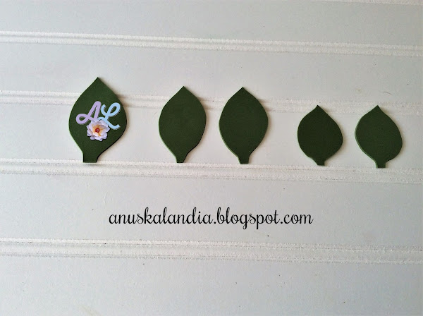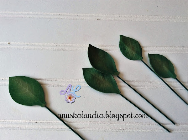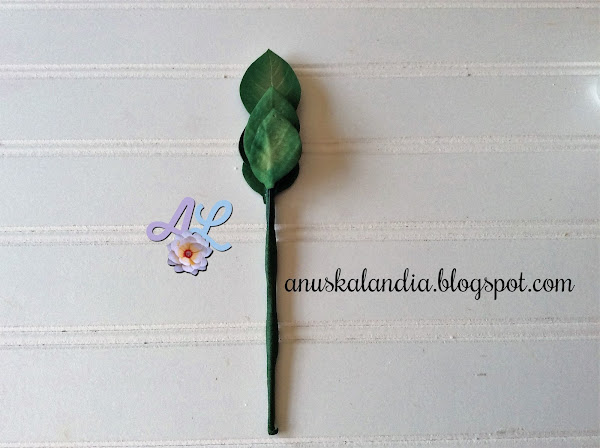 El alambre que tiene la hoja más grande, será el que nos haga de tallo de las 5 hojas. Iremos uniendo cada hoja con cinta floral a la altura que creamos conveniente, teniendo en cuenta que las pequeñas van abajo y las medianas hacia el centro. Cuando están montadas todas, abrimos.