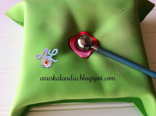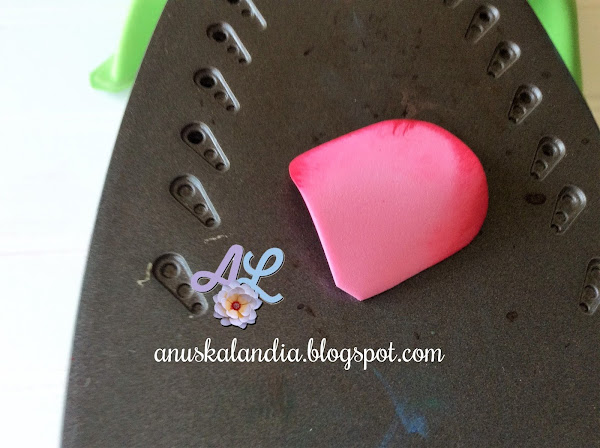 Tendremos preparada la esponja (la mía la tengo forrada de goma eva verde). Colocaremos el pétalo, de manera que nos quede la parte ahuecada encima de la esponja. Tal como se ve en la foto, esa es la posición que tendría que quedar en la esponja. De esta forma, como siempre digo, le da un aspecto más natural. Con el boleador o el objeto redondo se oprime como aparece en las fotos. Lo mantendremos unos segundos en esa posición, apretando para que tome forma.