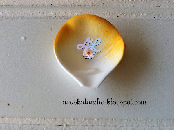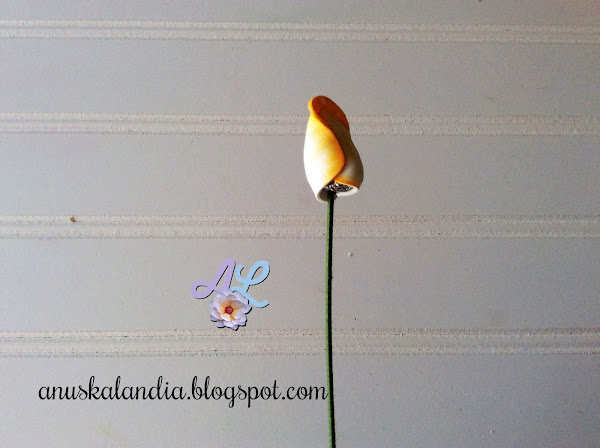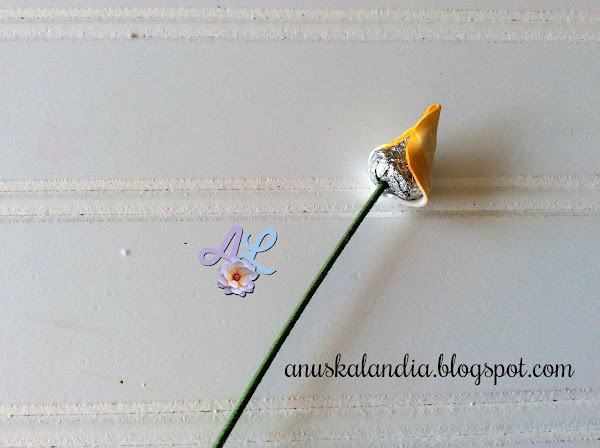 Uno de los pétalos pequeños. Le ponemos pegamento como se indica en la foto. En la parte inferior.