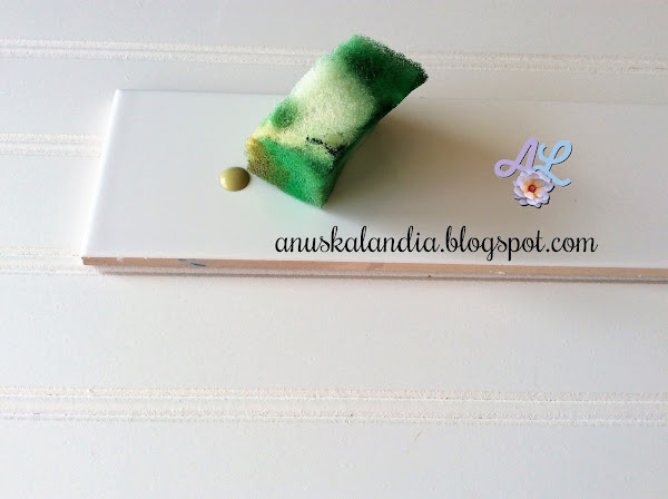 Ahora, vamos a pintar la parte inferior del pétalo. Sólo lo haremos en los grandes, por ambos lados. Para esta zona, vamos a utilizar otra esponja y el tono de pintura DA057 verde jade. Hacemos los mismos pasos anteriores: Gota de pintura, mojar esponja, retirar exceso de agua, coger gota, descargar y pintar. Lo haremos en la zona que se ve en la foto.