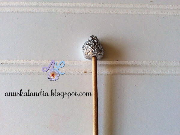 Tomamos un alambre floral, le ponemos pegamento o silicona en la punta superior y lo introducimos en el agujero que hemos hecho en el papel aluminio.