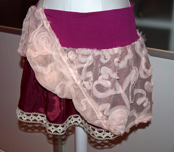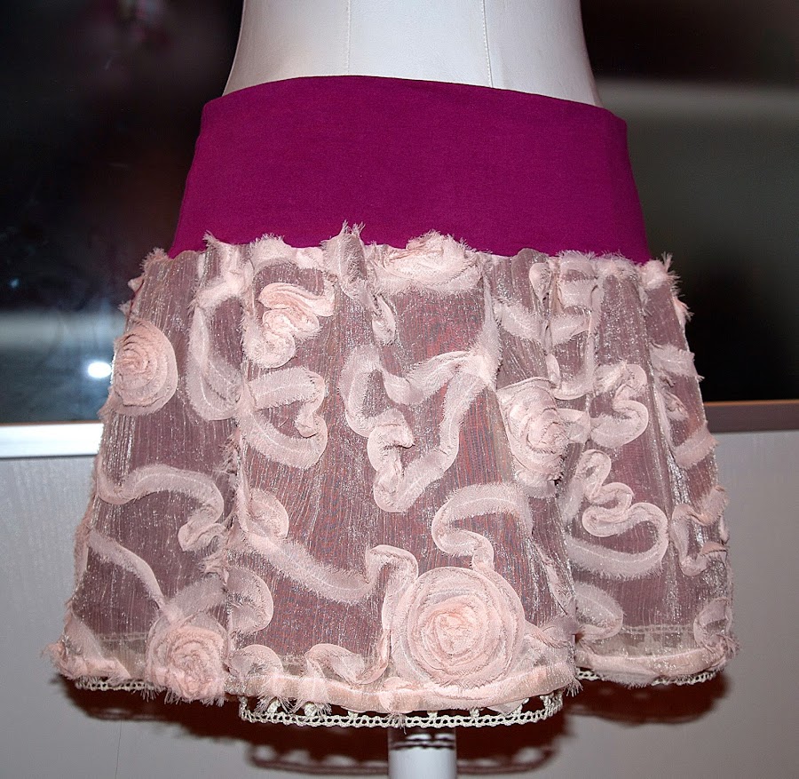 Hoy os traigo algo sencillo y resultón y lo mejor de todo reciclado!!, esta vez con 30 cm de tela que tenia por casa, una pieza preciosa de gasa en rosa empolvado y con rosas bordadas en tela, un trozo de forro rosa fuxia que he utilizado en varias cosas que he hecho y me quedo un trocito, una puntilla de mi caja de puntillas que me trajo una amiga que anda al acecho de las ofertillas que ve por las mercerías y un jersey de lycra liso que ya había dado de si lo suficiente y estaba un poco transparente pero perfecto para hacer la cinturilla de mi falda similar a la que hice en la falda de tul que podéis ver aquí.