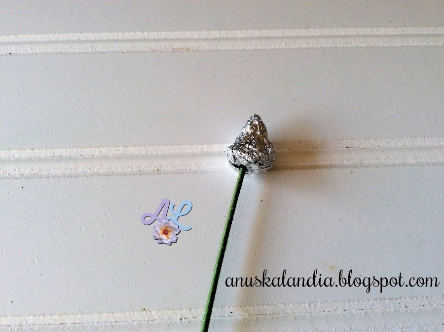 Tomamos un alambre floral, le ponemos pegamento o silicona en la punta superior y lo introducimos en el agujero que hemos hecho en el papel aluminio.
