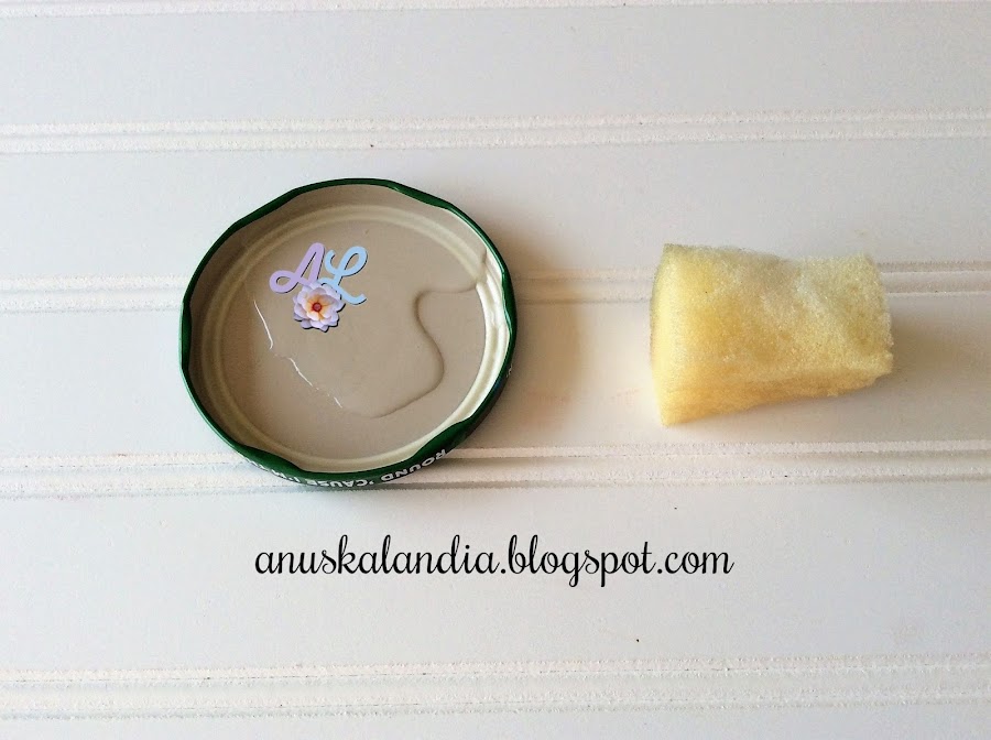 Ahora vamos a pintar. Echamos un poco de agua en la tapa de un frasco. Humedecemos la esponja. Escurrimos para que no haya excedente de humedad.