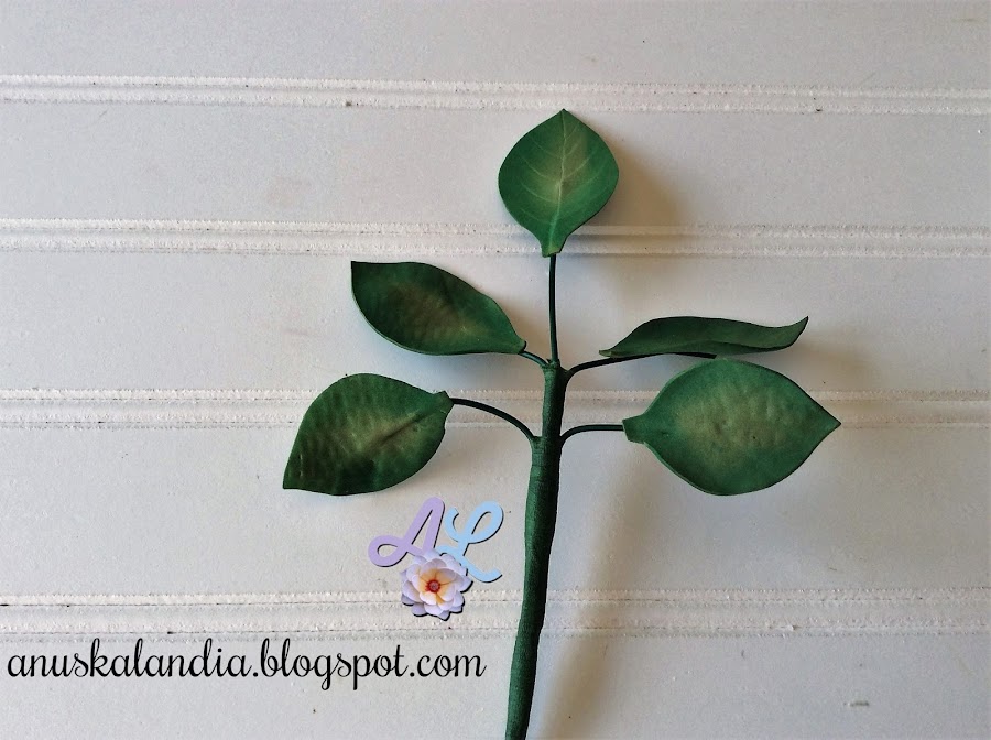 El alambre que tiene la hoja más grande, será el que nos haga de tallo de las 5 hojas. Iremos uniendo cada hoja con cinta floral a la altura que creamos conveniente, teniendo en cuenta que las pequeñas van abajo y las medianas hacia el centro. Cuando están montadas todas, abrimos.