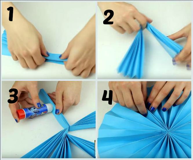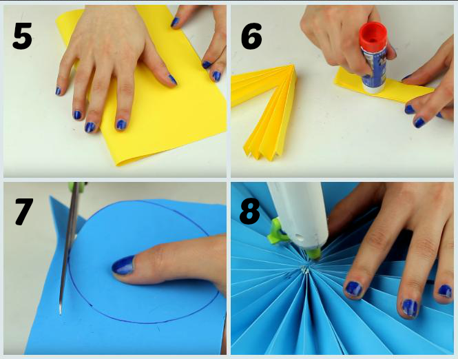 6. Comenzamos a doblar en zig-zag cada rectángulo recortado, como con el folio azul. Así con tres trozos y los pegamos de la misma manera.