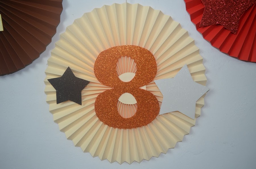 Para decorar cortamos en foami diamantado los números del año nuevo así como estrellas y lo que queramos, podemos usar los colores que mas nos gusten, tanto en los rosetones como en el foami.