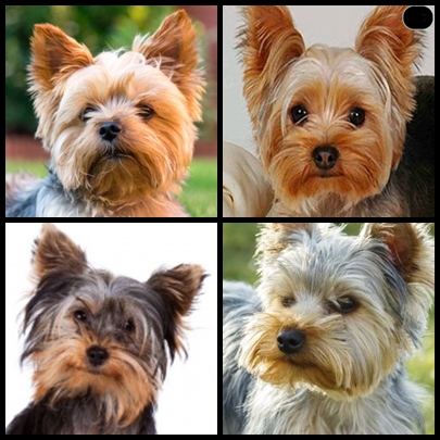 Lo primero que necesitamos para empezar a diseñar el rostro de un perro Yorkshire o cualquier otro animal, objeto, planta que queramos diseñar, son fotos de referencia. Nosotros usamos principalmente estas cuatro, pero sobretodo la imagen superior derecha.