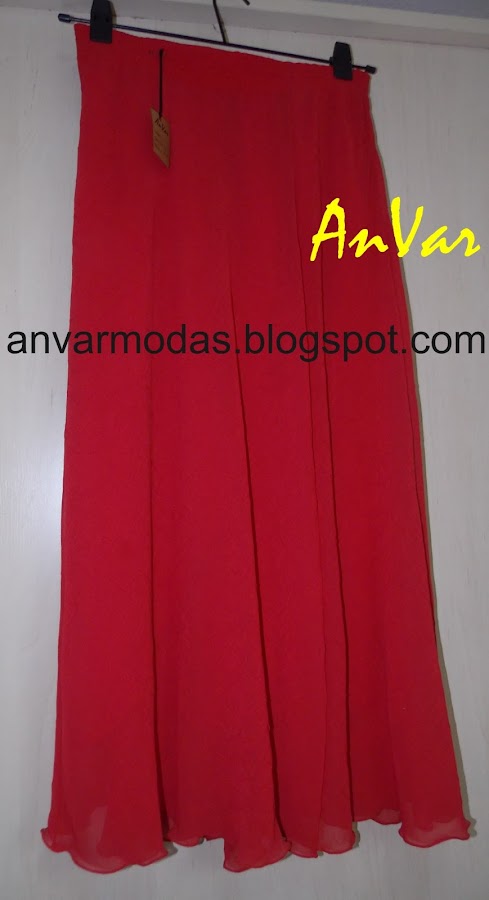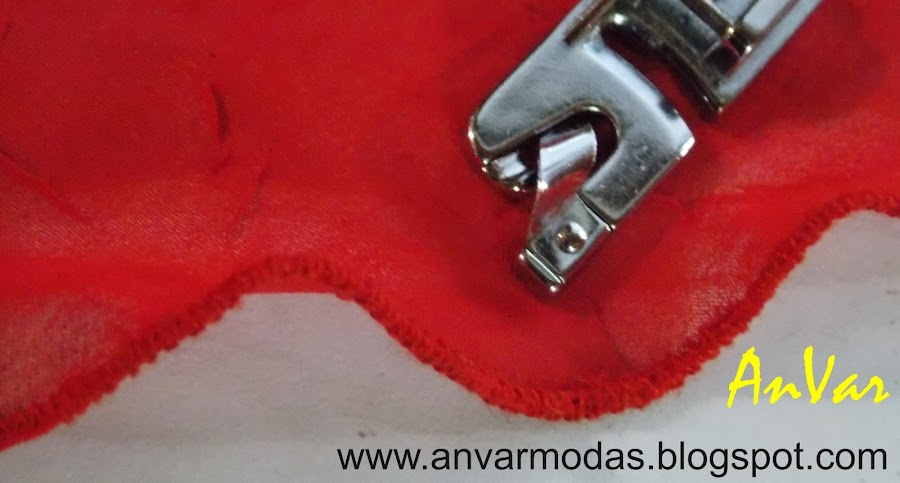 Podemos hacer una puntada más larga con lo cual lograremos una puntada más abierta y menos tupida como en el caso de esta falda roja de gasa crash...
