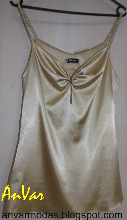 Pero también podemos utilizar este dobladillo con la puntada recta cuando no queremos que el bajo nos quede ondeado o estirado como en los casos anteriores. Para este caso de un top sumamente delicado en satén dorado en el que un dobladillo más ancho no sería indicado y tampoco el estirado, ésta es una opción ideal.