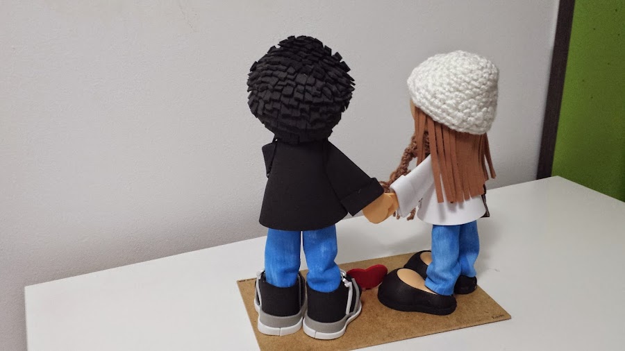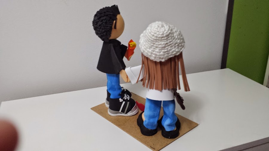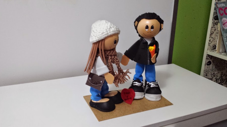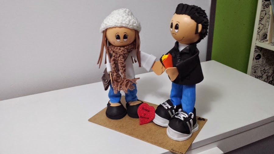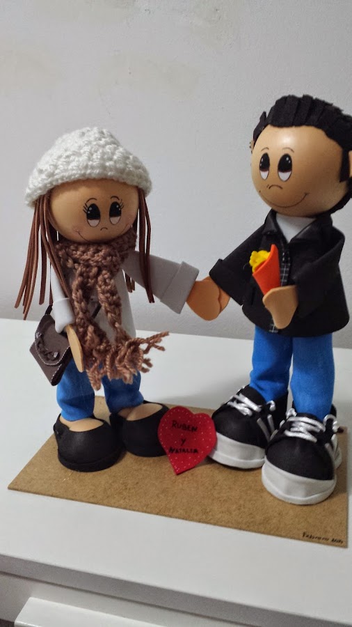 Hace un par de meses una amiga me pidió que si podía echarle una mano a hacer unos novios para su hermano que se casaba, así que la dije que se viniera a mi lugar de trabajo y la iría indicando para que ella misma los hiciera, y así le quedaron, bien bonitos.Más fotos en FOFUCHAS arte pino