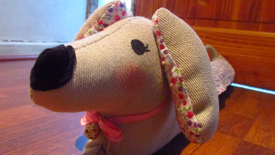 Si quieres que pese, pues elijes o bien piedrecitas pequeñas, o arroz. Pero siempre metido en una bolsa, o repartido en varias, que se colocan una vez has rellenado y dado bien la forma al perro, para que queden en la base. Luego cerraremos cosiendo a mano con una puntada invisible.